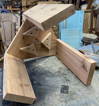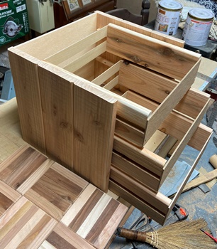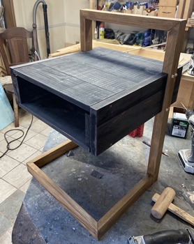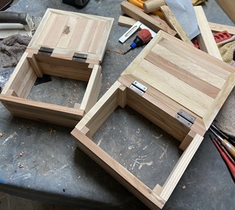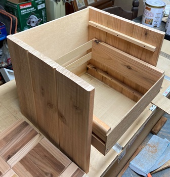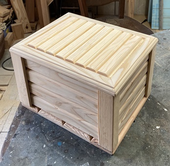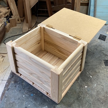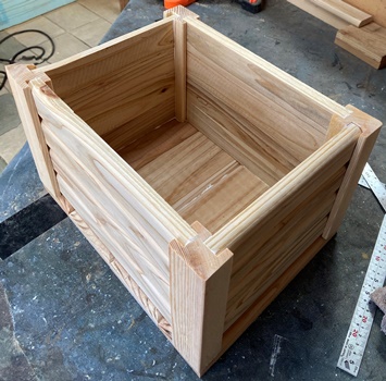 ネットで見た形状が面白かったのでやってみた。 フレームの高さ60cm、幅40cm、ハコの奥行き40cm。 フレームを杉の角材(3cm*4cm)、ハコを杉の貫材接ぎ合わせで。 杉の貫材、14mmモノなのでタボ接ぎでなく擦り合わせ接ぎで、裏に1cm厚の補強板を渡しておく。 |