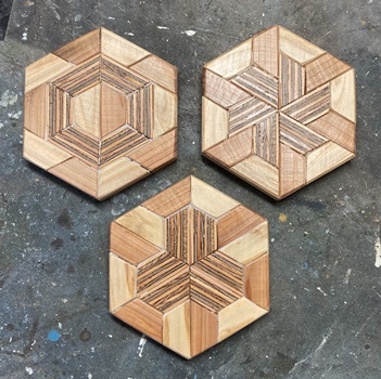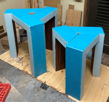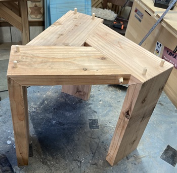 <その4> テーブル板 何度も作った台形組み合わせのテーブル板。合板の模様が面白い端切れがあったのでアクセントに。 きれいな板になったんじゃないかと思う。何度もやっていると、流石に収まりが良くなってきた。 |