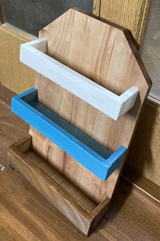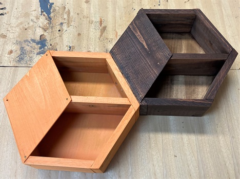 以下の3つはetc...じゃなく、おまけ取扱で。 _/_/_/ おまけ1 _/_/_/ つい最近にもやった壁掛け六角形フレームに、中心に棚板と表面にひし形アクセントを乗せてみた。 わりと洒落てる...んじゃないかなぁ? ただ、このテの壁掛けは、壁(塀)に取り付けるまでが作業ともいえます。 |