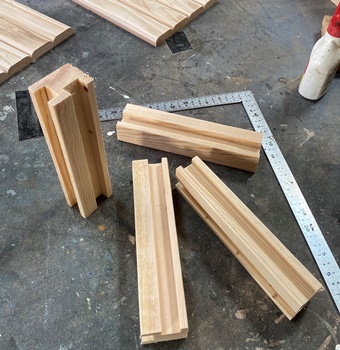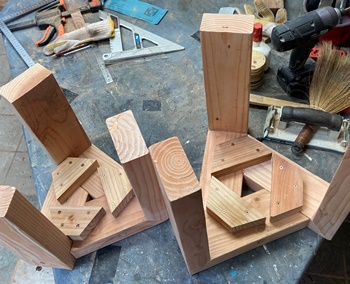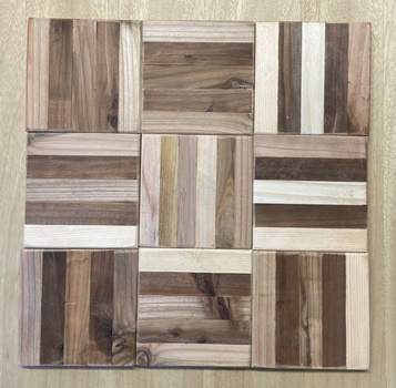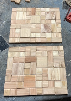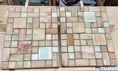 | <その3> 模様板 正方形と長方形のブロック組み合わせが面白いので、24cm*30cmの模様板を2枚作る。小さい正方形が3cm四方。 小パーツの面取りは大変だけど、もっと丁寧でもよかった。 |