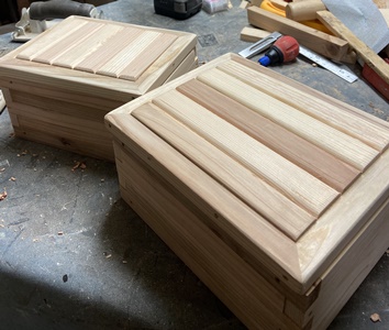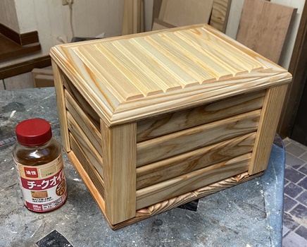なんかハコづくりのモードになってますが、今回はハコ四隅の柱を軸に組んでみようとして始めたもの。 側板などの表面に釘ネジを使わずに、(ちょっと丁寧に)巾接ぎする前の板を1枚ずつ面取りし、木口3cm*4cmの柱に掘った幅16mm*深さ10mmの溝で組み込んでみた。 厚さ15mmの側板、きれいに収まってくれました。 29cm*22cm、深さ18cmの玉手?箱2号もどき...。 上蓋も中厚の額縁づくりでまとめて、ほぼ成形完了。 |