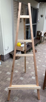 奥さんからの注文で、速攻で作った簡易イーゼル。 80号(1455mm*1120mm)のキャンバスをかけられるように。 前に油絵の額をまとめて作ったときの角棒(木口3cm*4cmの2m長)が残っていたので、ほぼそっくりそのまま使う。 支えの後ろ脚を固定した状態で、高さが約180cmほど。 長いので蝶番付けるのにちょと苦労。 |