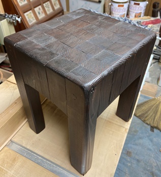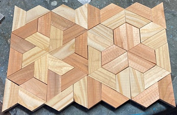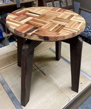 脚と天板を60°カットで、天板を平行四辺形にカットして組んでみた。 切り落とし端材、形が揃っているので寄せてみたら鍋敷きに使えそうなのができた。(左) もらった3cm厚の集成材の端材で。磨かなくてもきれい。(^^;) |