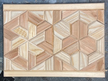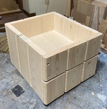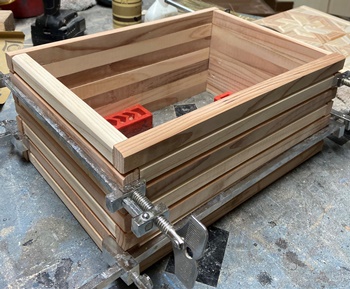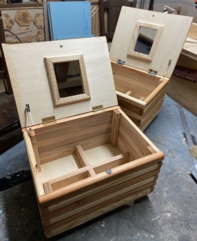 | 2つ同時に製作。模様板のパーツ面取り、前回はベルトサンダー使ったけど、今回はトリマーを使用。 縦横32cm*24cm、深さ15cmで組み接ぎ。しかし、何度やっても内側蝶番の取付は難しい。 作りは前のと同じだけど、2つなので杉の赤白とデザインなどシンメトリーでも並べ方を変えてみた。 |