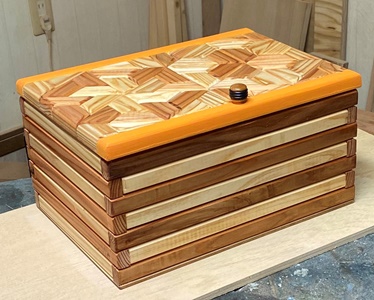 壁の四面は2cm幅で組み接ぎ。杉の赤みと白みを交互に組んできれいに収まった。 ハコのつくりは前回とほぼ同じだけど、縦横23cm*32cm、深さ14cmで蓋に出っ張り部分もないのでつまみを付ける。 仕上げはチークオイル(透明)で。 蓋の前後だけアクセントにオレンジ色を付けたけど、とてもいい感じに仕上がった...と思う。 |
