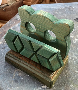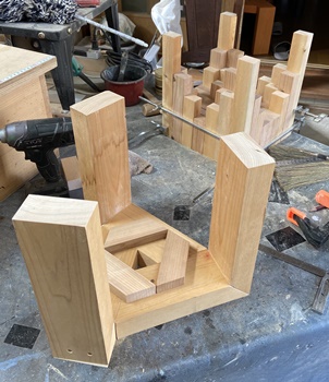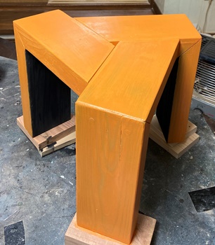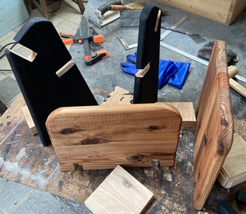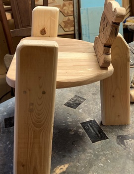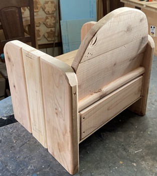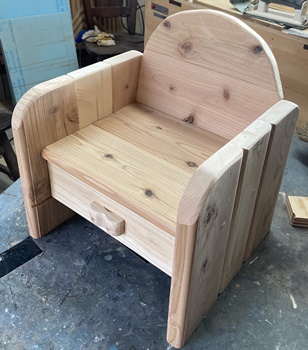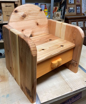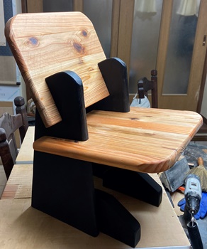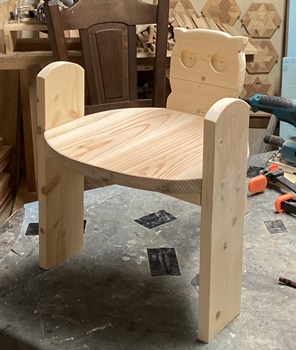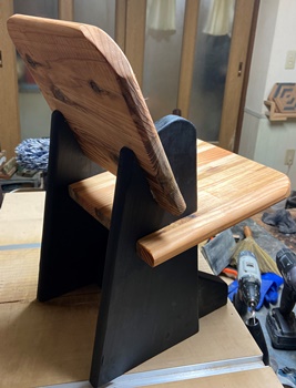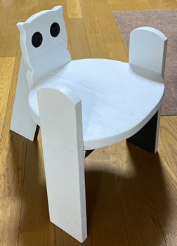 形は面白いのだけど、どうも構造設計上に欠点があったようで、孫が座ると前のめりになってしまう。(*_*) 仕方なく側板(脚)の内側前方に靴を履かせて何とか収まった。 デザイン的にはきれいだと思えるので、又そのうちに再挑戦してみようと。 |