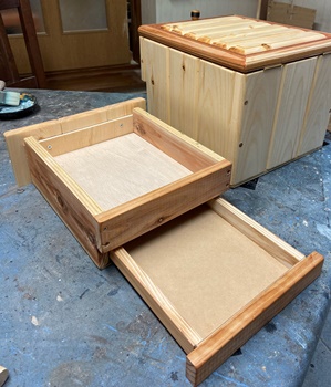 見えないところに抽斗があったら面白いだろうな...と考えてたのを形にしてみた。 1*4の3枚巾接ぎと15mm,10mm厚の杉板で、高さは20cmのボックスに。 |