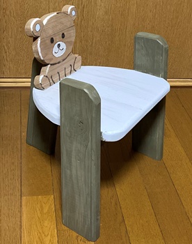 クマちゃんイス。(^^ゞ 座面の高さ25cm、幅29cm、奥行き23cm。 塗料は、新しく入れたペールグレーとオリーブツリーってので仕上げてみた。 落ち着いた感じで仕上がった。 |