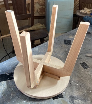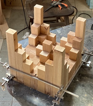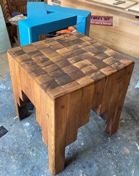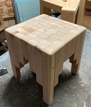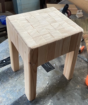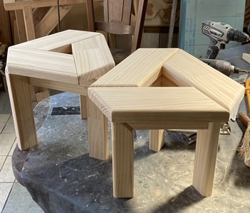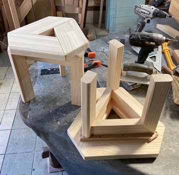 4cm*3cmの杉の垂木。 脚は30cm、内側に20cm 15cm 10cm と並べて組む。 ボンドが乾くまでの時間、勿体ないので三角イスを作っておく。 |