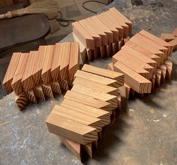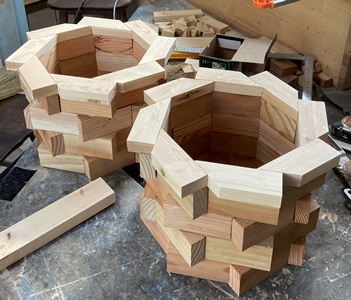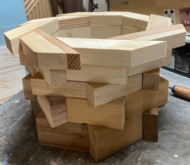買ってきた(端材だけど)米松で揃えて八画積み木プランターのパーツを切り出す。(上右) 木口45*25mm * 120mm長で片側45°カットしたのを 64本 |