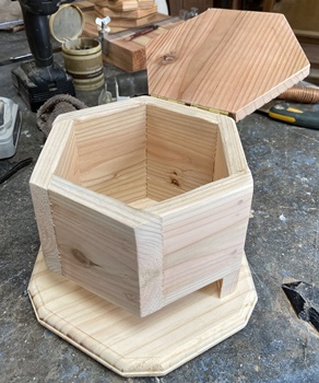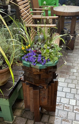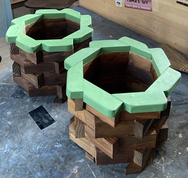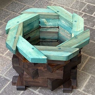 | 内径が約20cm、高さが22cmほどの中ぐらいのプランター。 塗りは防腐効果を考えて積み木をウォルナット、上の飾り八角形と内側をステイン系のグリーンで。 いつも塗りなど最後の仕上げで台無しになることが多いけど、まぁまぁかな...と。 |