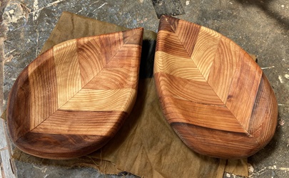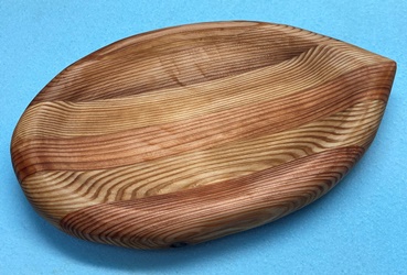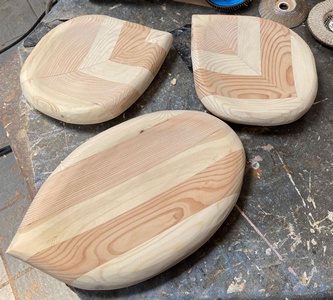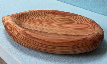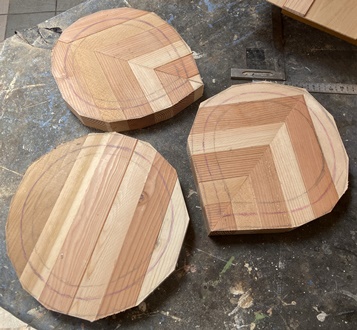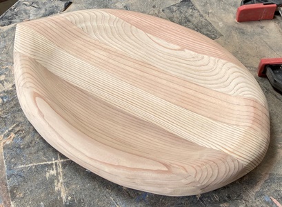 | 皿の深みは1cm程度で、丸く丸く...の手触りを大事に。 1枚板でなく接ぎ合わせの模様が面白いかと。木口45*35mmの杉垂木で21cm*32cmほどの大きさ。 |