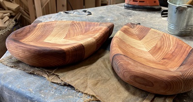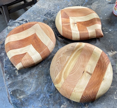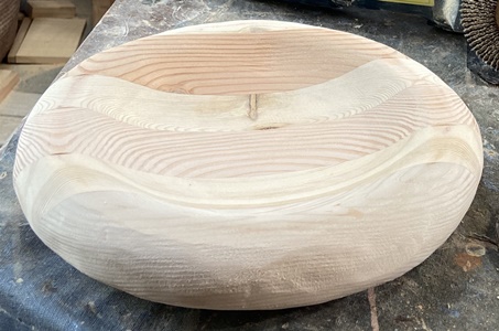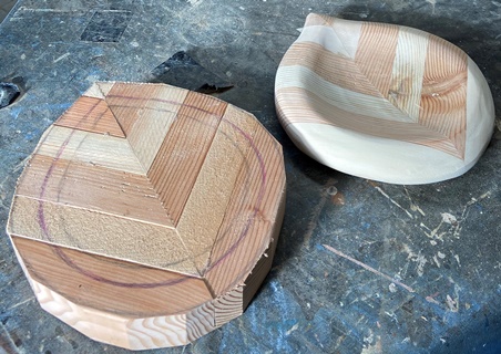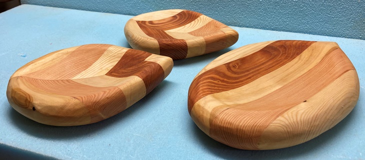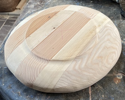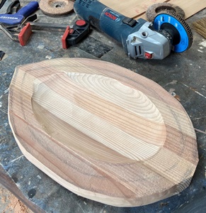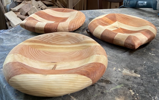 接ぎ合わせてしばらく締め付けてあった45mm厚の板、木皿オブジェを又々作る。 |