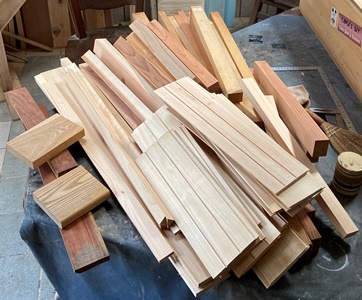 "木のコンビニ"という所を紹介してもらって、プロ用の大きな材からDIY用の端材まで実に大量にあって 目移りするばかり。で、買ってきた端材が下(左)。(買ったのは50円100円コーナーばかりなんですが...(^^;) ) 左端の数本は銘木の端切れをおまけでもらった。いい場所見つけたなぁと嬉しくなる。 |
