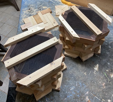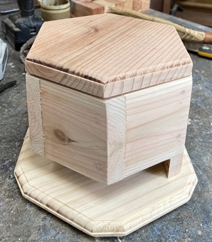| ボンドで止めながら、積み上げる度に内側で6cmビス止め。ガッチリとかなり頑丈。 底に網を張って、下駄を履かせて完了。 |