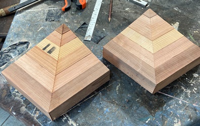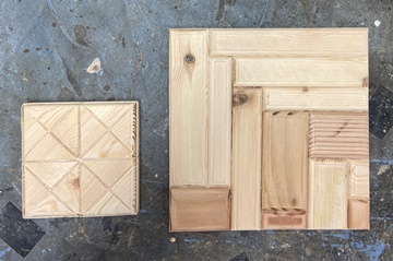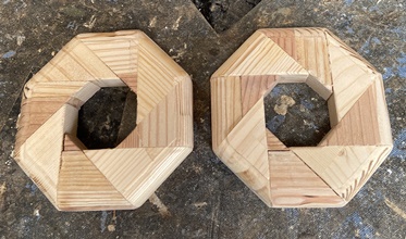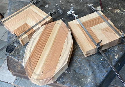 | 上の製作などで出た切り落とし端材、勿体ないので例によって寄せて形にしておく。 左の大きい正方形は2cm厚で21cm四方の板になり、何かの機会に役立ちそうです。Ecoです。(^^ゞ |
