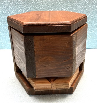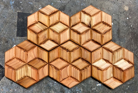 完成度はさすがにやる度にちょっとずつは高くなっているのかも。(^_^;) 葉っぱ模様にした方は、前回の反省を生かして"正確に45°カット"、"貼り合わせの押さえは時間をかけて2度に分けてやること"などちょい手間をかけてみた。 削り磨きをもっとしぶとくやれば、さらに面白いのが出来るんでしょうね。 |
