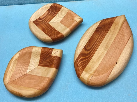 | これは上のを半分にしてさらに斜めカットして葉っぱ模様をイメージにしたもの。 きれいなんだけど、斜め接ぎ合わせはハタ金などでの押さえ締め付けが難しくて難儀した。 まぁまぁにはまとまったけど、作業工程上の反省など生かしてもう一度やってみる予定。 |