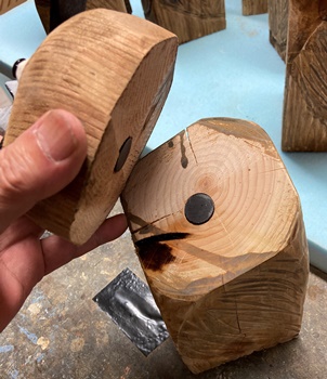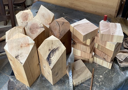 | 12cm角材を5cm厚の輪切りにして頭部に、10.5cm角材を大きさバラバラだけど胴体にして製作。 |