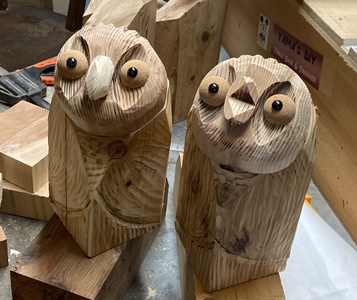 | 背の低い(胴18cm)2体だけ、斜めカットを20°でおさえて、磁石を埋め込んで首が動くようにした。 微妙に表情の異なる立体フクロウで、庭の片隅にでも置いてもらって福が来ますよーに。(^o^) |