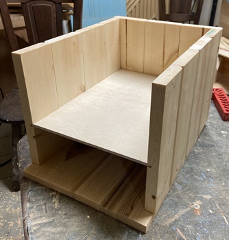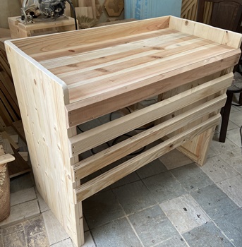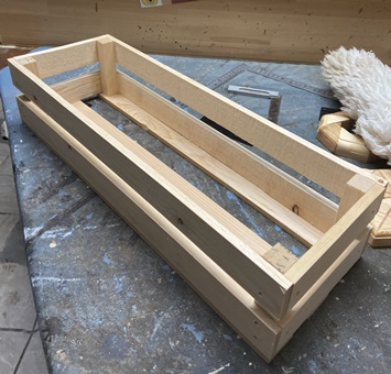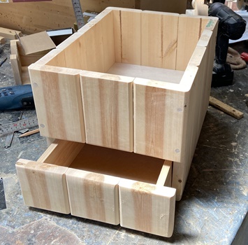 側板は1*4、天板は前に作ってあった飾り板を額縁にして。 サイズはA4がゆったり入る大きさで、深さは上のボックスが14cm、抽斗部が9cm。 |