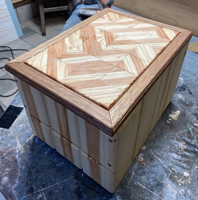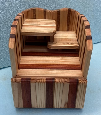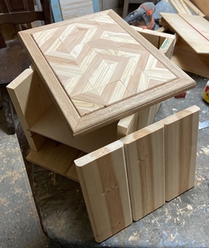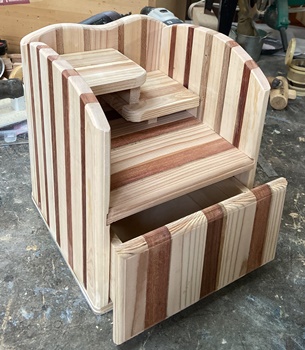 ちょっと小ぶりな、飾り違い棚ボックスができた。 クルミ材などの赤味が鮮明で、材料がいいと仕上がりも流石にいい感じ。 |
