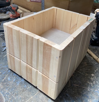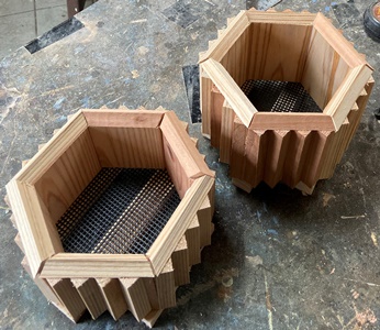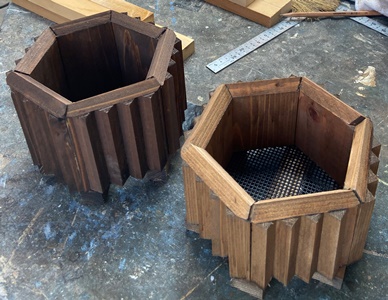 | 室外機カバーの前面幅木で45°カットした切り落とし端材を、六角ボックスの表面に貼り付けてみた。 小さいプランターで、一株二株植えて眺めてみるのも案外いいかも。 |