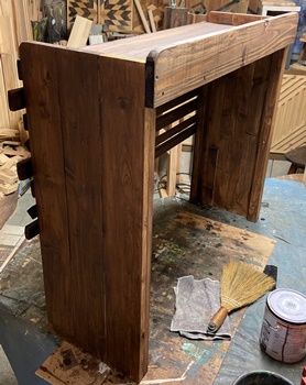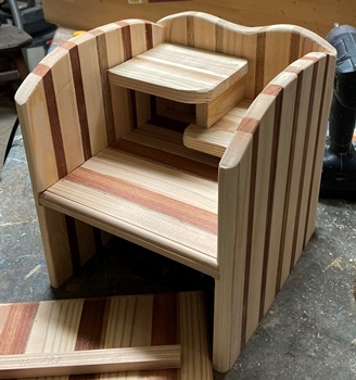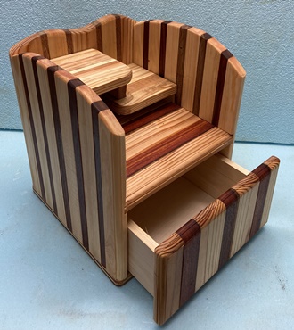 クルミ材の板などもらったきれいな端材が1~2枚あったので、15mm厚の巾接ぎ板を数枚作って、 これでなにかできないかな...とぼんやり考えてできたのがこれ。 |