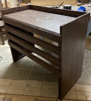 ほぼイメージどおりの形に仕上がる。 ガイドレールの赤味が前面に見えるのが面白い...と思う。 ただ、抽斗の出し入れで側板とのすき間の遊びを2mmほど余計にとったことで、A4用紙の横幅がキツキツであたってしまうサイズになってしまったのが失敗、残念。 |