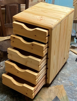 チークオイル仕上げで完成。 抽斗は寸法がシビアで作業はなかなか気骨が折れる。 抽斗の把手は付けず削った凹みで間に合わす。 横幅がもう2~3mm広くやれたらサイズ的には文句なしだったんですが、きれいに仕上がったので、まぁいいことにします。 (^^ゞ |