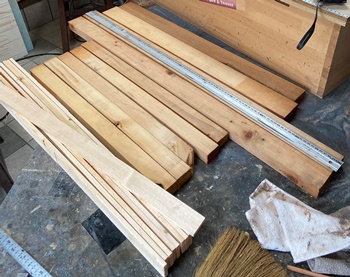 側板を2cm厚の杉板で、深さ8cmを5段つくる。 ガイドレールに使ったのは15mm厚の赤味の材で、9mmで縦挽きしたのを10mmの溝にはめこむ。 |