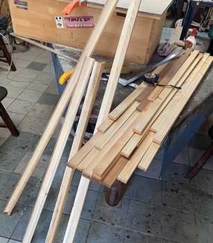 1cm厚の檜ハメ板を3cm幅でカットしたのを30cm長から何枚か用意したが、長い材を(端材群から)探すのに一手間。(^_^;) |