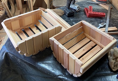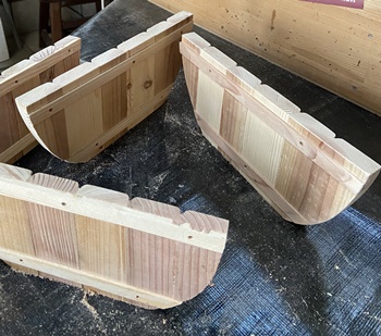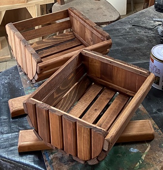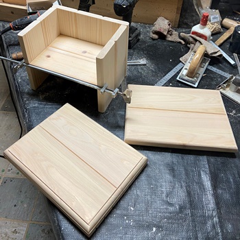 バスケットの2段重ね..は、特に形がユニークってわけでもないのだけど、6枚接ぎ合わせした側板の内側に16mm幅、6mm深さで溝掘ってサネを埋め込んだのが今回の一手間。