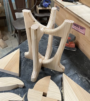 脚をどんな形にしたら面白いかなぁと考えていて、4本脚になるように、3cm厚の(赤松? パイン?)集成材(37cm*15cm)を4枚、こんな風にカット。 |