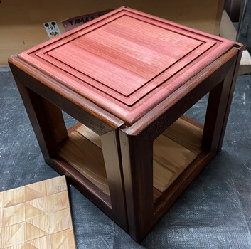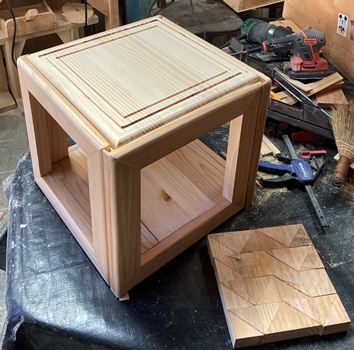 天板は15mm厚の集成材。アクセントに10mm幅と6mm幅の溝を彫り込む。(^^ゞ |