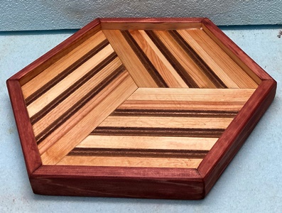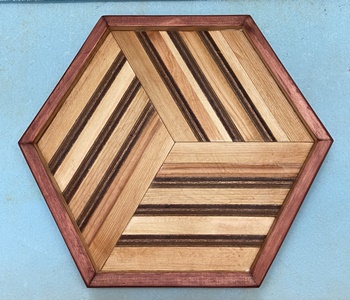 | 正三角形の組み合わせでは前にやったのだけど、色味の濃淡がしっかり出せたのでひし形の120°接合で。 置いといても場所をふさがない、きれいな六角形トレイになってくれた。 |
