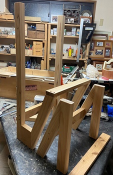 | 三角形部分だけを黒塗りして、Z形の脚(木口25mm*50mm)はチークオイル仕上げ。 スッキリがっちりとなかなか格好がいい。(^^ゞ お洒落なリビングに合いそうです...。 |