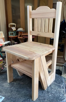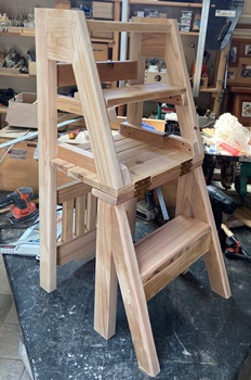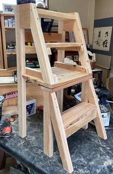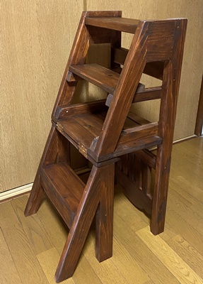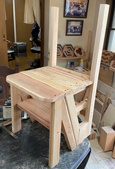 「折り畳んで格納できるような踏み台があったら...」って、リクエストもらってたのでやってみた。 注文のイメージとはちょっと違うかも知れないけど、イスだったら置いといても邪魔にならないだろうと思っての製作。 イスの後ろ半分をひっくり返してステップになるように。 イスの座面高41cm、背もたれ部の高さ82cm、斜め接合面の角度21°で組む。 |