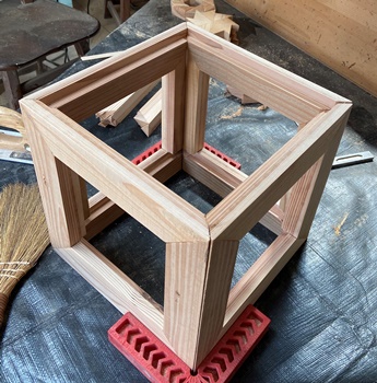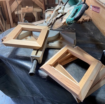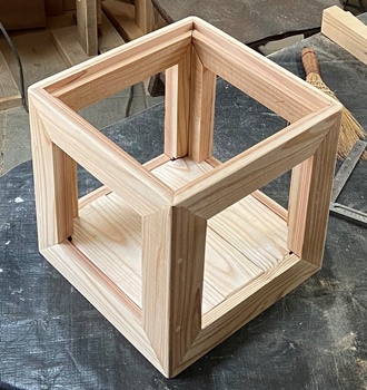 | 1つめにやったのが上の額フレーム8段重ねボックス。 1.5cm厚 2cm幅 18cm四方の額フレーム、はじめは22cm高のワンボックスだったのを、 深くて使えるイメージがわかなかったので、2つに切断した。(それでもまだ用途が不明...) (^_^;) |