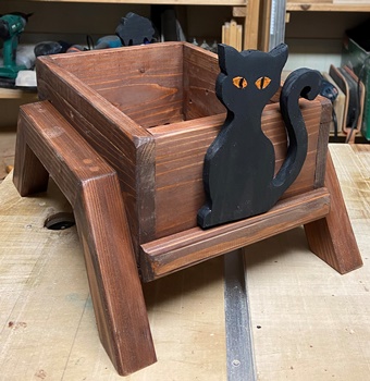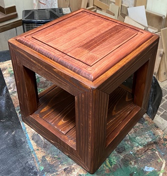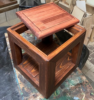 | どこに置いても何かにちょいと使えそうな花台。 構造は簡単だけど、塗りを丁寧にやったので、わりといい色が出ています。 |