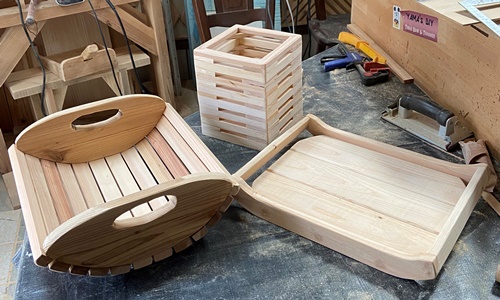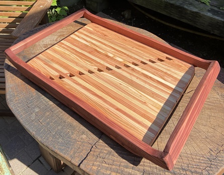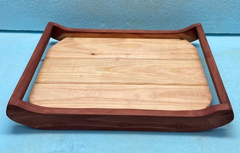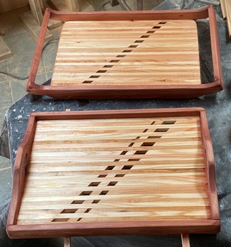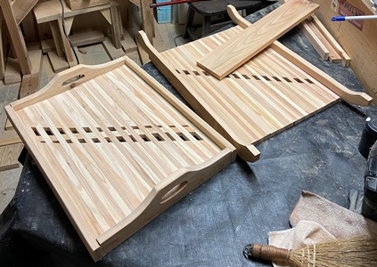 | これもリクエストがあって作った 大判の木のトレイ2つ。 底板の内寸37cm*50cmで、 かなり大きい。 底板にした接ぎ合わせ板は15mm厚の杉、フレームは20mm厚でカットした米松などを使う。 仕上げは底面をチークオイル、フレームを着色オイル+透明ニスで。 3〜4人のお客さん用に、 いっぺんでモノを運ぶのには、 これぐらいでかくないと面倒みたいで、ちょっと面白さよりは実用優先の木のトレイ。 |