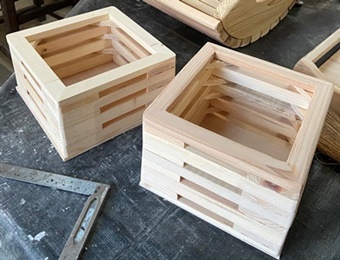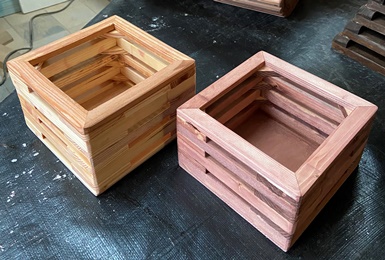 | 天板は25cm四方で19mm厚の集成材を1枚板にして乗せる。 天板固定せずに、大物も中に置くことが出来るように、フタの開け閉め?自在に。 |