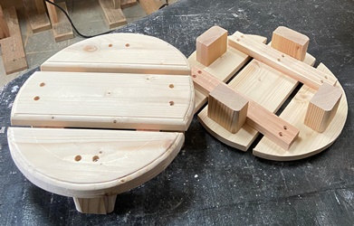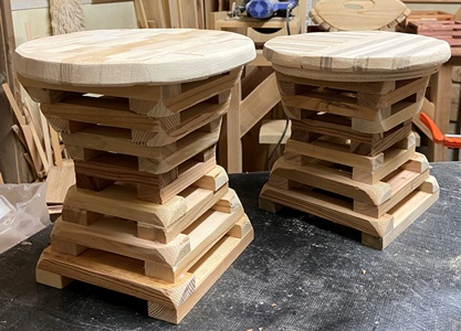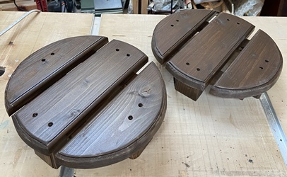 | 4つめは、15mm厚でカットした材が残って勿体ないので作った。 腰にくびれ?をもたせた 積み木花台。 くびれをもっときれいにするには、5~7mm厚板ぐらいで重ねた方が見栄えがいいんでしょうね。 積み木部分はウォルナット、 天板はオイルでサッと仕上げる。 天板の直径22cm、高さ23cmと 21.5cmの2つ。 積み木の下(裏)からの ビス打ちでちょい苦労。 天板は模様板の端切れを接ぎ合わせて再利用。 |