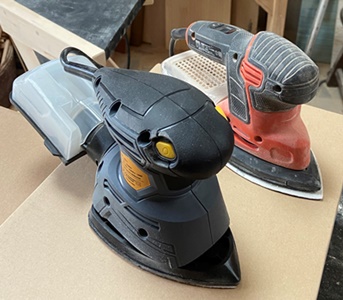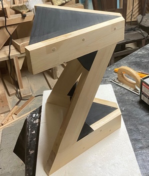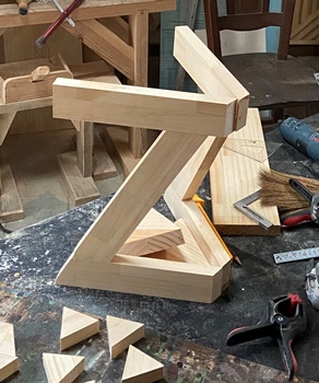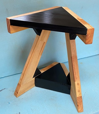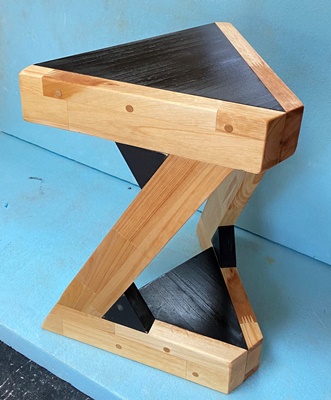 正三角形にカットしてとっておいた切り落としの厚板(25mm)が2枚あったので、気になっていたZ形のスツールを作った。 (底面に2枚重ねて役立てる。) 高さが40cmで整えたスツールで、材は全て25mm厚の集成材を使う。 天板の三角形一辺が29cm。 |