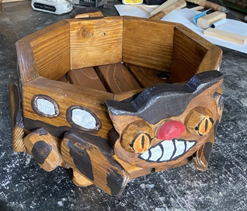 | 八角形ハコは、考えた末にトトロのネコバスのイメージで。(八角形ネコ、ちょっと無理っぽかったかも。) ドラえもんも候補に挙がったけど、文字通りのマンガ製作。(^^ゞ |