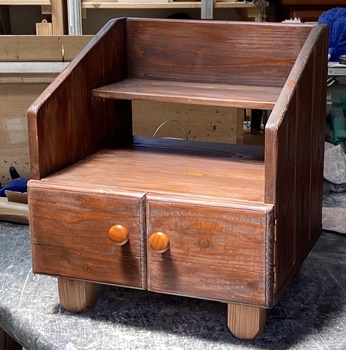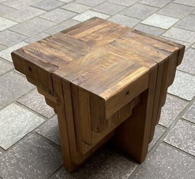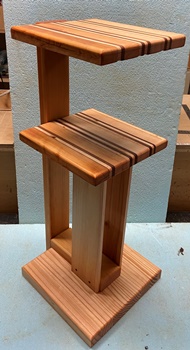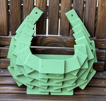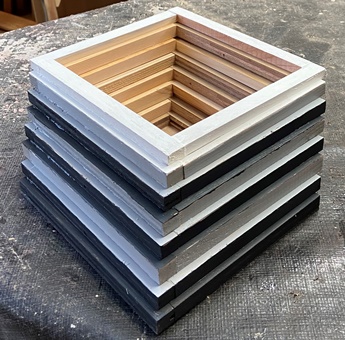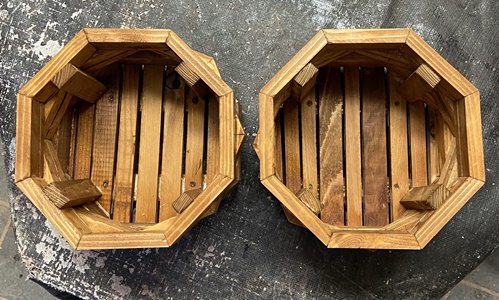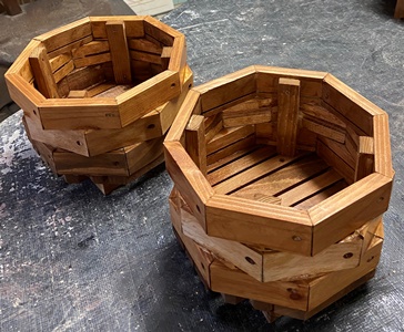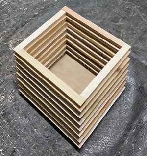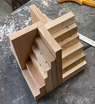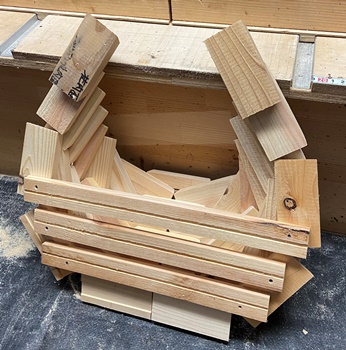 | 15mm厚の杉板(など)端材を4cm~4.5cm幅、10cm長の台形パーツにしたものを並べて重ねて、 壁掛けバスケット..の様な形にならないかな?と組み重ねてみた。 |