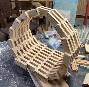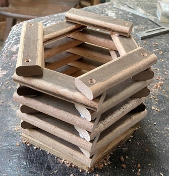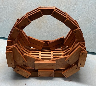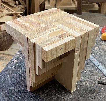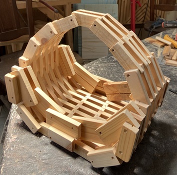 | 12mm厚、3cm*8cmの木片を交互に丸く組んで、組み木のバスケットを作る。 どうなるか不確かなまま始めたけど、何とか安定してつながって一安心。(^^ゞ |