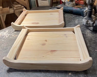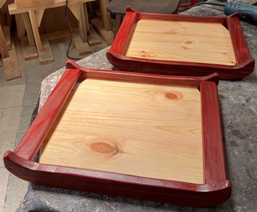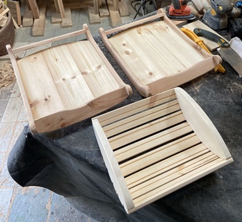 | 底面(ヒノキ)27cm*35cmの木のトレイ。とりあえず2つ作った。(もうなくなってしまった。) 木のトレイ、喜んでもらっていってくれる人が多く、手許にながくとっとけない。 |