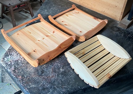 | "など"が下の2つ。 木のトレイは、お客さんの手土産に喜ばれているので作っておく。チークオイルのみの仕上げ。 |