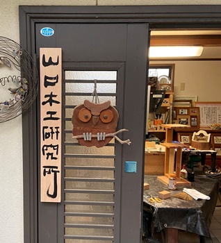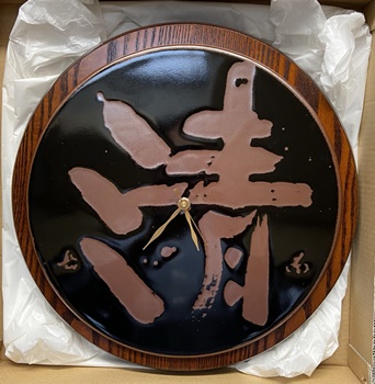 | (左) 著名な書家と陶芸家のコラボによる壁掛け時計。大きく重量もあるので設置場所を慎重検討中。 (右) 看板。これも著名な書家の一筆で、冗談のようで面白いので恥ずかしいけどドアに貼付。(^^ゞ |